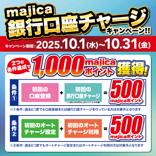 ① キャンペーン期間中、新規にmajicaに銀行口座を登録し1回あたり5,000円以上のチャージを行うと500majicaポイントを贈呈